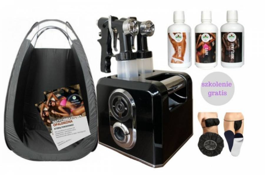 zestaw startowyProfesjonalny zestaw i kurs opalania natryskowego z certyfikatem oraz urządzenie opalające najnowszy model Venus w zestawie z płynami, materiałami marketingowymi, art. jednorazowego użytku.